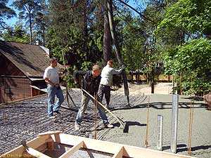 - Заливка бетонной стяжки, выполняющей функцию черновых полов на первом этаже.