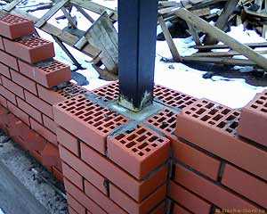 - Если в качестве опор будет использоваться камень или кирпич, то в таком случае копается яма и начинается укладка кирпича или камня на раствор бетона. Но здесь необходимо сделать своими руками армирование арматурой. А для возможности проведения монтажных работ следует закрепить и вывести из стоек металлические пластины и уголки.