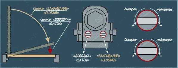 Регулировки скорости открывания двери и «прихлопывания» находятся на корпусе. Чаще всего они или на лицевой части под защитной крышкой или на боковой его поверхности.
