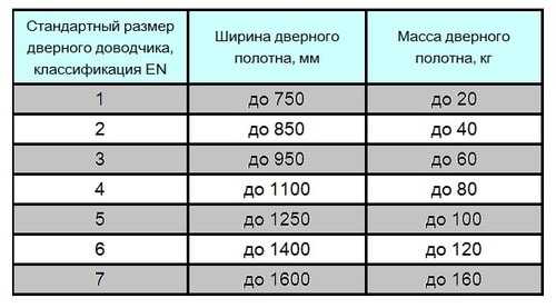 | Класс доводчика для двери | Ширина дверного полотна, мм | Масса дверного полотна, кг |