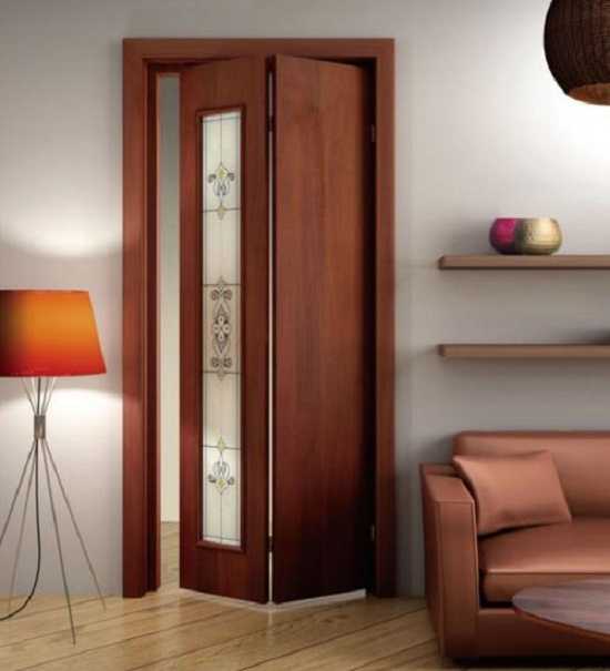 Необыкновенно оригинально смотрятся композиции дерева либо ДСП со вставками из другого материала. Это могут быть матовое либо цветное стекло, витражи, кожа либо дермантин. Нужно ли гласить, что выбор материала и дизайн раскладной двери должны быть кропотливо обмыслены и гармонически вписываться в интерьер помещения, являться, на самом деле, его изюминкой.