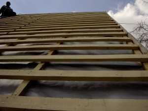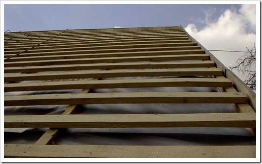 - По завершению устройства 3-4 рядов системы обрешетки остальные доски можно уложить на скат и затем брать элементы со ската. Это обеспечит некоторое удобство.