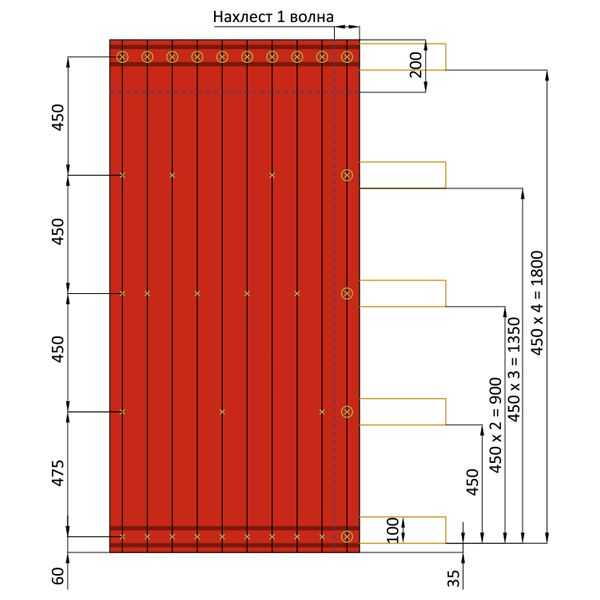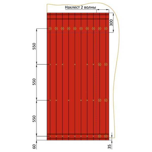 - Если угол наклона больше 10°, выполняется обрешетка с шагом по осям 600 мм, боковым нахлестом в одну волну и концевым нахлестом около 170 мм.