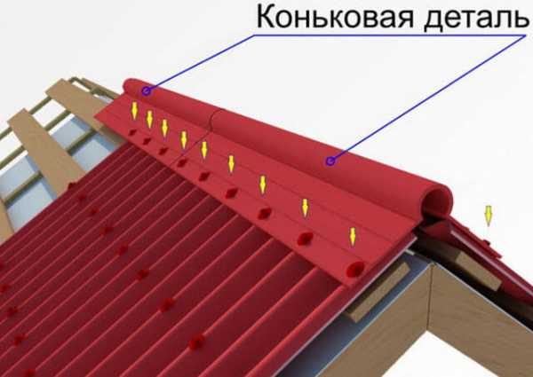 Крепление коньковых элементов нужно начинать с противоположного превалирующим ветрам края с нахлёстом 12,5 см. Прибивать коньковый элемент нужно по каждой волне нижележащего листа к дополнительным брускам обрешётки. Для закрытия просветов и обеспечения вентиляции можно использовать заполнитель карниза.