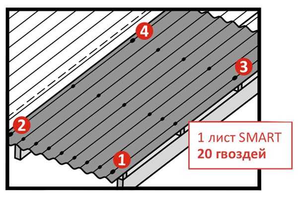 - Не отступайте от правила – каждый лист крепим 20 гвоздями. Во-первых, это гарантийное требование. Во- вторых не закрепленные надлежащим образом листы может оторвать от крыши сильным ветром.