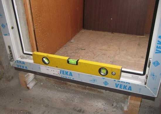 - При помощи строительного уровня тщательно выверяют расположение конструкции в вертикальной и горизонтальной плоскости. Корректировку делают применяя монтажные клинья.