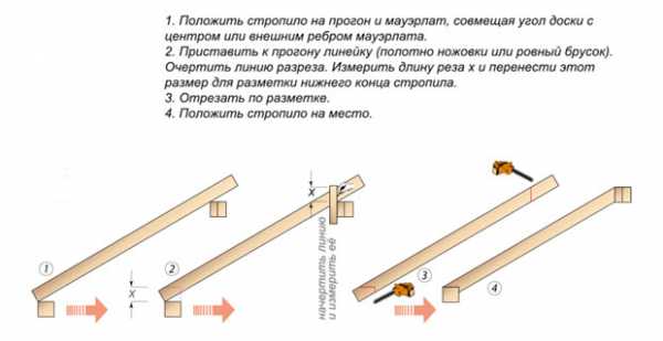 Работы по выполнению крепления осуществляют в определенном порядке. Предлагаем вашему вниманию несколько самых простых методов распиловки и последующей подгонки стропил.
