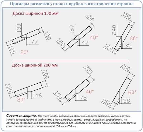 - В верхней части шаблона размечают верхний запил. Форма запила должна быть такой, чтобы доска ложилась на коньковый прогон и при этом плотно прилегала к противоположному стропилу. Глубина запила должна составлять не более 1/3 ширины доски.