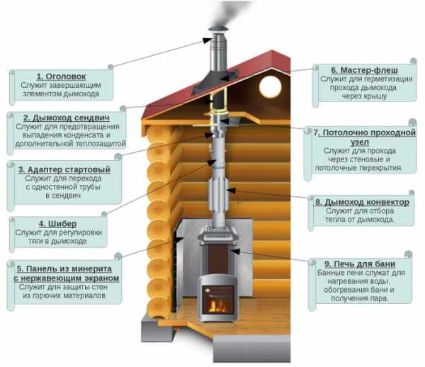 Устройство обычного дымохода через потолок для банных печей может состоять из таких элементов: