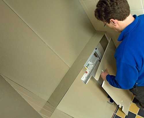 В гипсокартоне вырезаются все технологические отверстия, после чего он фиксируется на каркасе саморезами. Гипсокартон отделывается плиткой.