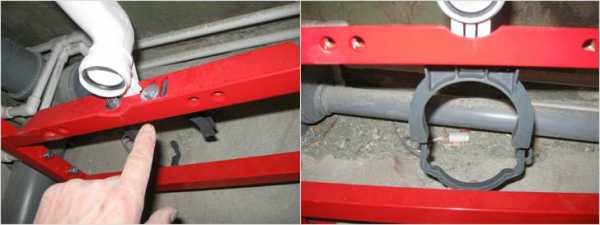 - Примерьте инсталляцию и отрегулируйте ножки таким образом, чтобы канализационный патрубок оказался под поперечиной для установки прибора. Сверху наденьте кронштейн со шпильками и ответьте точки их крепления к стене.
