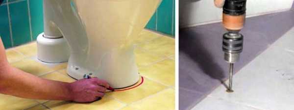 - Поставьте унитаз на пол в правильное положение, соблюдая минимальные размеры от стен. Обведите подошву маркером по контуру и отметьте точки крепления на полу.