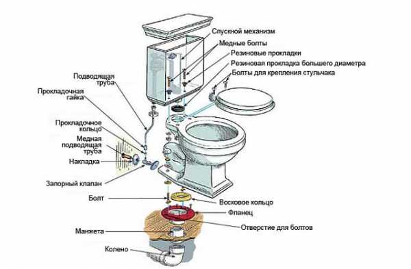 Для окончательной сборки остается прикрутить к чаше бачок и подключить его к водопроводу. Смажьте резиновую прокладку силиконовым герметиком, совместите ее с отверстиями в унитазе, а затем поставьте сливной бачок и закрепите болтами. Расположение всех деталей отражено на картинке: