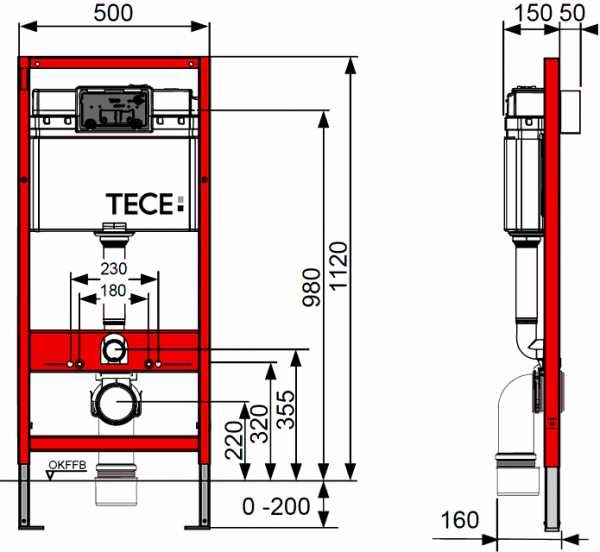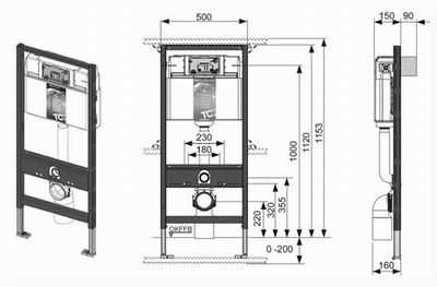 Этот современный элемент для настенного крепления унитаза представляет собой металлическую раму, оснащенную сливным бачком со встроенной кнопкой. Перемычка, куда устанавливается консольный сантехнический прибор, регулируется по высоте, а под ней выведен канализационный патрубок. Размер от стены до инсталляции тоже регулируется благодаря шпилькам, но не может быть меньше 150 мм.