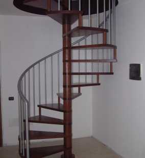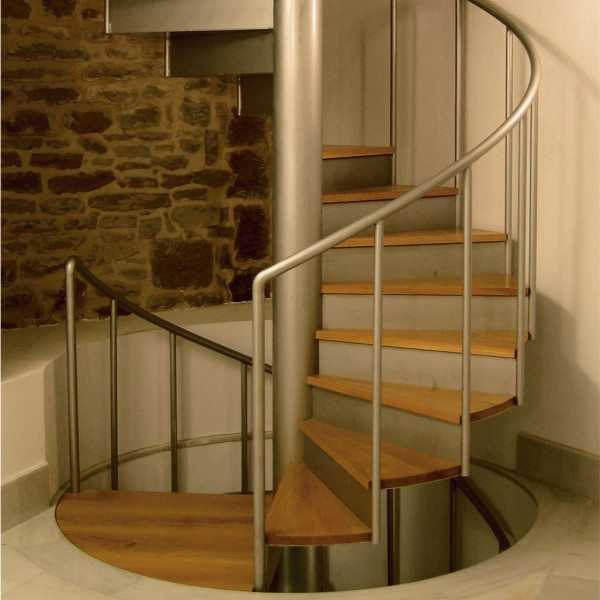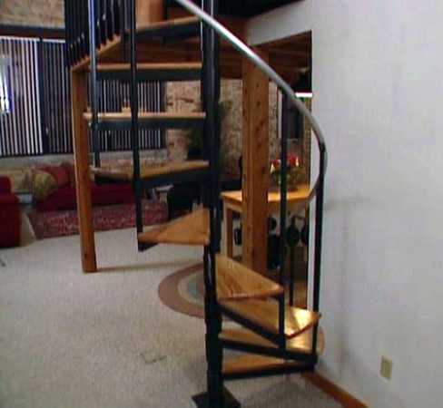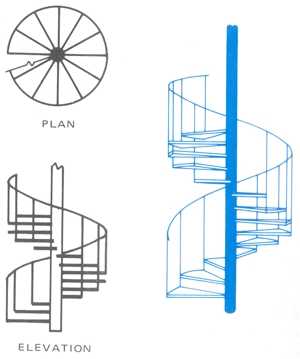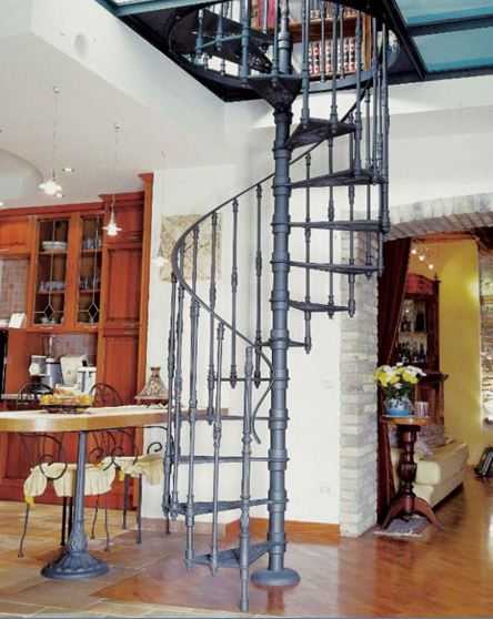 Как следует из названия, винтовая лестница имеет вид спирали, начинающейся на первом этаже и идущей наверх. В качестве опоры для ступеней служит центральный столб, изготовленный из металла, или прочные тетивы. В некоторых конструкциях опорный столб полностью заменен тетивами, а функцию вспомогательных креплений выполняют стены и балясины.