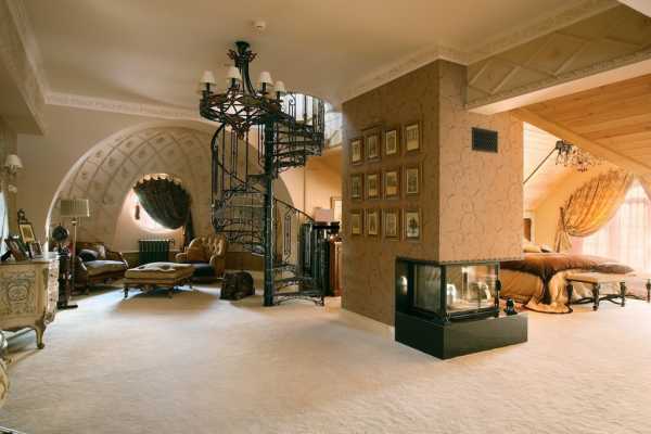 - Экономия свободного места. Как упоминалось выше, винтовые лестницы занимают небольшое количество площади. Ступеньки в таких конструкциях монтируются непосредственно вокруг опоры. Со стороны создается впечатление, что они парят в воздухе. Такая особенность позволяет устанавливать винтовые лестницы в очень маленьких комнатах.