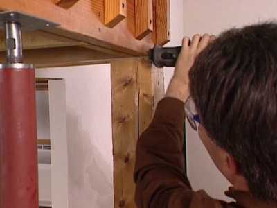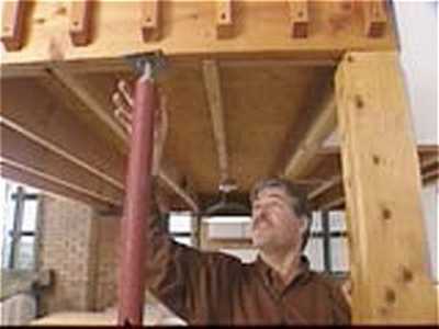 Вы можете передвинуть несущие опоры, если дизайн вашей винтовой лестницы требует этого. Используйте временные опоры для поддержания платформы (изображение 1), пока вы удаляете балку с угла верхнего помещения. Используйте элекроножовку, чтобы отрезать вбитые под углом гвозди несущей опоры (изображение 2), а затем приподнимите верхнее помещение. Теперь вы можете переместить несущую опору, куда вам захочется. Заделайте отверстие от балки в полу, если необходимо. Уберите временную опору.