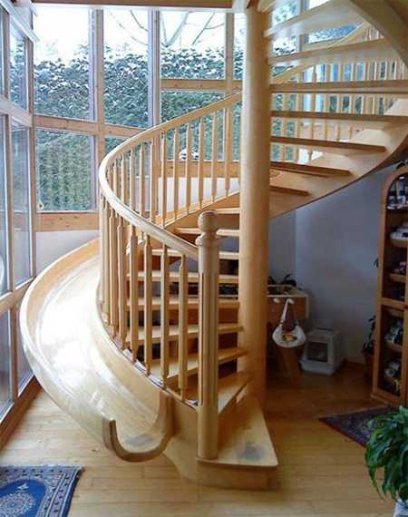 Ради объективности стоит отметить также и минусы, которые присущи спиральным конструкциям. Ввиду того, что их ширина и строение не позволяет транспортировать по ним габаритные предметы (мебель, технику, стройматериалы), они скорее выступают в качестве дополнительной лестничной конструкции. Многие специалисты рекомендуют оборудовать дом классической маршевой лестницей, проходящей снаружи. Кроме того, ежедневное кружение по винтовой лестнице проблематично для людей с ограниченными возможностями.