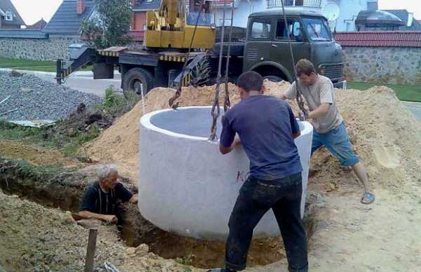 Существует два способа укладки железобетонных колец. В первом случае их укладывают по мере углубления – как только глубины достаточно, чтобы поместилось первое кольцо, его укладывают и продолжают копать дальше. Подкапывая почву под кольцом, добиваются его дальнейшего заглубления и укладывают сверху новые кольца. Благодаря этому можно обойтись без лебедки и уложить кольца очень осторожно и аккуратно. Если же укладывать кольца в уже полностью готовый котлован, то это потребует немалых сил и помощи еще нескольких человек.