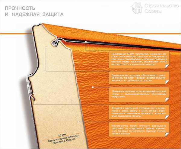 Секции подъемно-секционных ворот изготавливаются как утепленные, так и обычные. Утепленные устроены из сендвич-панелей — утеплитель, заключенный в оболочку из тонкой стали.
