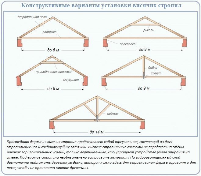Висячая стропильная система отличается тем, что ее стропила опираются только нижним концом на мауэрлатный брус, установленный на наружные несущие стены. Верхний конец стропильных ног такой конструкции ни на что не опирается, а как бы висит в воздухе, из-за чего возникает 2 типа нагрузки: на изгиб и на распирание.