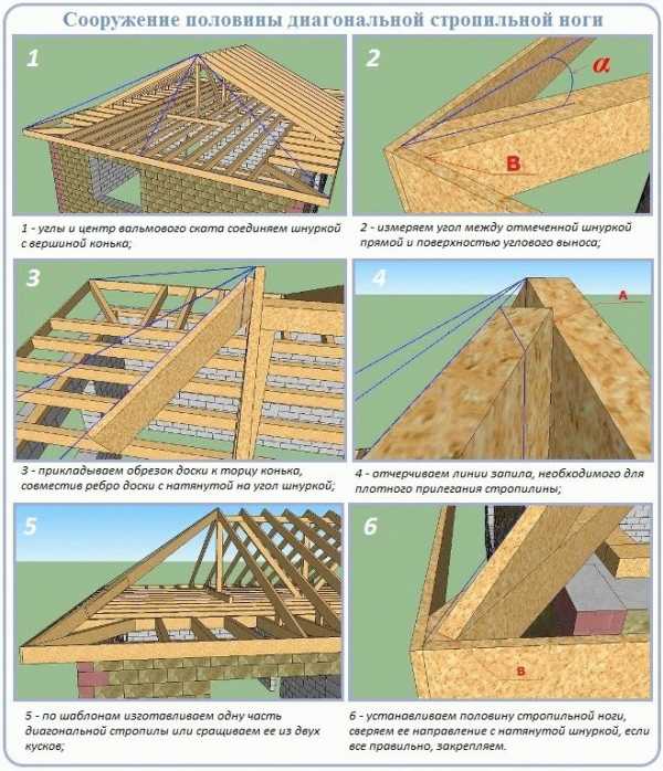 - Установка диагональных стропильных ног, соединяющих углы систем с вершиной опоры или крайними точками конька.
