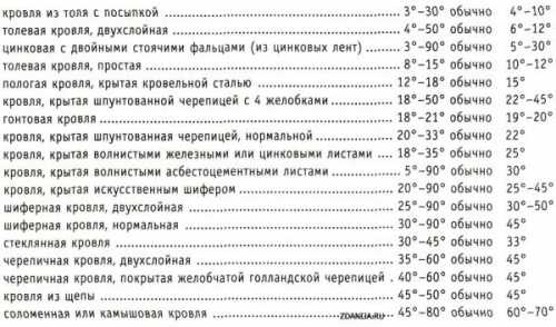 Окончательный выбор кровельного покрытия зависит от угла наклона стропил, так как для некоторых материалов существуют ограничения по наклону. В приведенной ниже таблице указаны основные кровельные материалы и углы наклона для них.