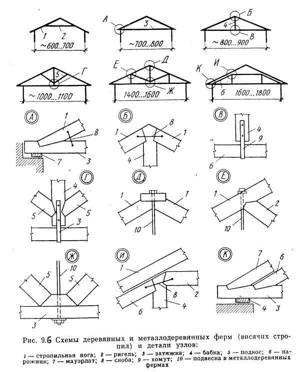 Рис. 36. Различные конструкции стропильных перекрытий: а – при пролете до 5 м; б, д – до 8 м; в, е – до 10 м; г – до 6 м; 1 – стропильная нога; 2 – мауэрлат; 3 – коньковый прогон; 4 – лежень; 5 – стойка; 6 – перекрытие; 7 – затяжка; 8 – ригель; 9 – бабка.