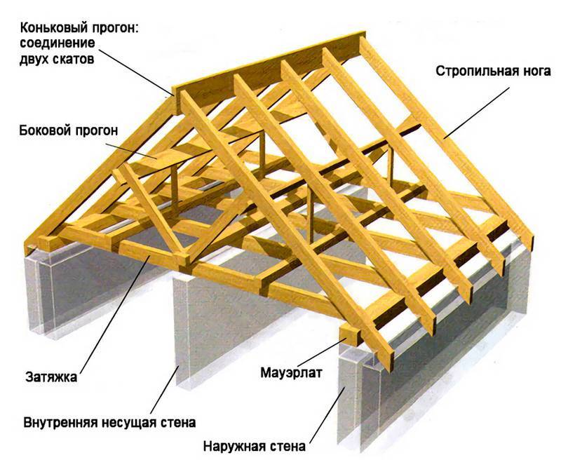 Итак, любая скатная крыша состоит из мауэрлата, стропильных ферм, обрешетки и кровли.
