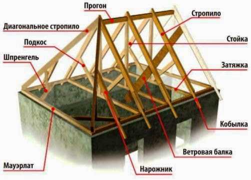 Основные элементы стропильной системы частного дома на примере четырехскатной крыши показаны на рисунке: