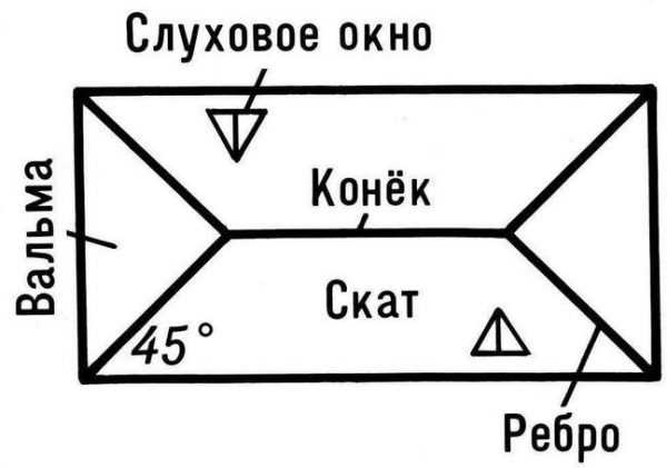 Вальмовые крыши . Являются вариантом четырехскатных кровельных конструкций, у них два ската имеют вид трапеции, а еще два – треугольника (прочитайте также: «Стропильная система вальмовой крыши: схема «). Для создания такой формы нужна схема крыши дома. Часто вальмовую кровлю можно встретить в южных регионах, поскольку она хорошо переносит усиленные ветровые нагрузки (подробнее: «Проект вальмовой крыши — порядок работы «).