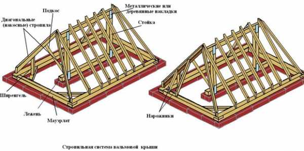 Вальмовые кровли потребуют использования диагональных стропил и нарожников (короткие стропильные ноги, поддерживающие диагональные стропила с обеих сторон). Работу по возведению крыши дома своим руками лучше выполнять вдвоем. Это связано с трудностью монтажа – один человек не сможет грамотно провести все работы (прочитайте: «Строительство крыши своими руками «).