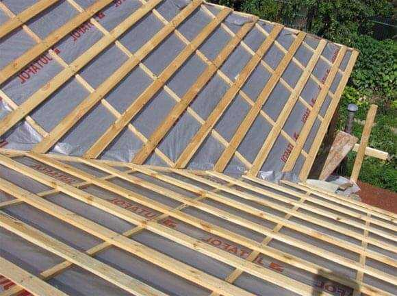 Закончив установку стропил, можно набивать обрешетку. Для ее обустройства понадобятся доски (2.5 см в толщину) или бруски. Обрешетка может быть как сплошной, так и иметь зазоры. Но перед тем, как построить крышу. следует проложить гидроизоляцию по стропилам. При создании жилой комнаты на чердаке, лучше всего заранее произвести утепление крыши. Утеплитель укладывается в пространство между стропилами. В качестве материала может выступать минеральная вата или пенопласт.