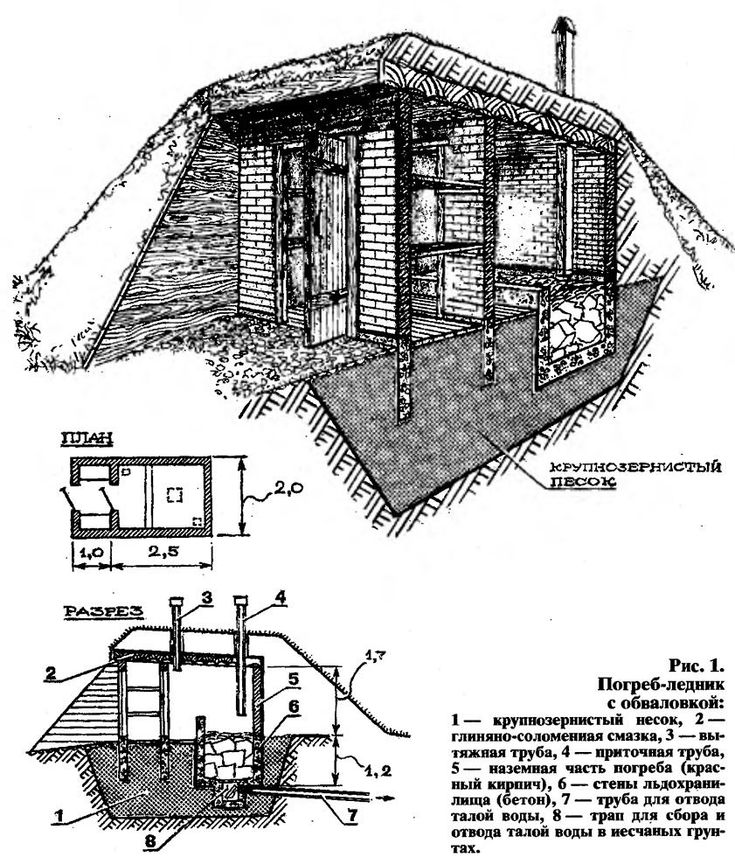 - Ледник со льдом – самый простой вариант хранилища. Для этого подойдет обычный земляной или полузаглубленный подвал, который нужно наполнить льдом. Весной, летом и осенью это поможет сохранить продукты свежими, а также предотвратить развитие грибков и плесени.