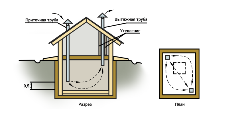 На схеме показана естественная вентиляция в подвале, устроенная по всем правилам
