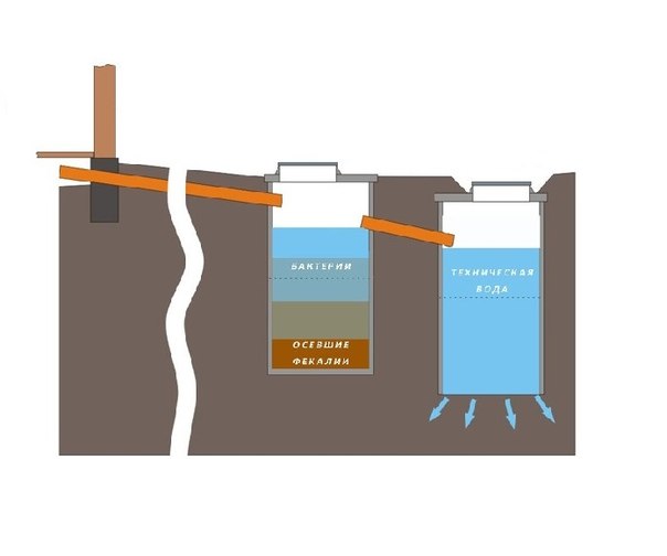 Простейшая конструкция выгребной ямы с переливным отсеком включает две части, первая из которых служит накопительным резервуаром, вторая — поглотительным колодцем