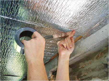 - Далее потребуется конструкцию обшить фольгой. Она крепится клейкой лентой к теплоизолятору. Рекомендуется фольгу укладывать в два слоя.