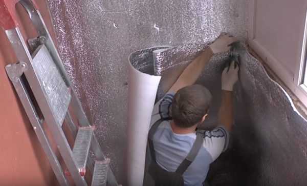 В качестве теплоизолятора хорошо себя проявляет фольгированный пенополистирол. Он крепится на стены при помощи полиуретанового клея и дюбелей-«тарелочек». Стыки плит пенополистирола, а также участки примыкания материала к полу и элементам оконной системы проклеиваются алюминиевой липкой лентой.