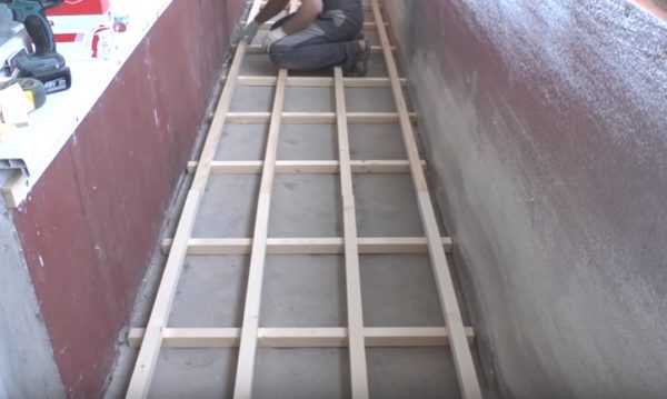 Когда все коммуникации уложены, переходят к заливке стяжки. Ее толщина – 3-5 см по всему периметру лоджии. У основания стены монтируется демпферная лента толщиной 1 см и шириной 10 см.