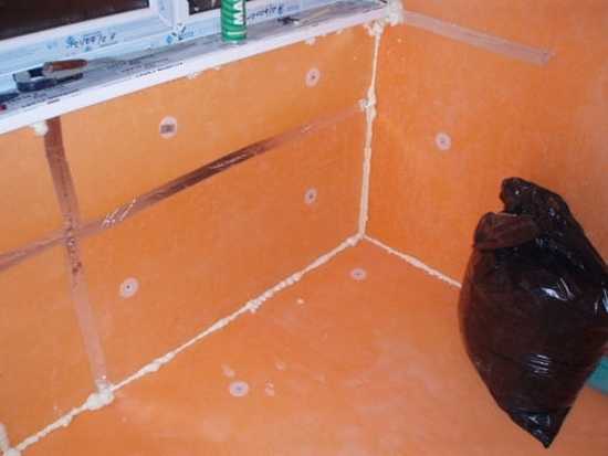 - Уложить гидроизоляционную мембрану, закрепить швы строительным скотчем. Необходимо следить за тем, чтобы материал плотно прилегал к стенам.