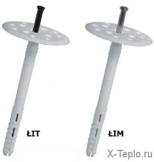 - Чтобы пеноплекс надежно держался на стенах до установки пенофола и обрешетки, его необходимо закрепить дюбелями с шляпками. Для этого сверлим с помощью перфоратора отверстия прямо через утеплитель в стену, после вставляем дюбель и заворачиваем шуруповертом.