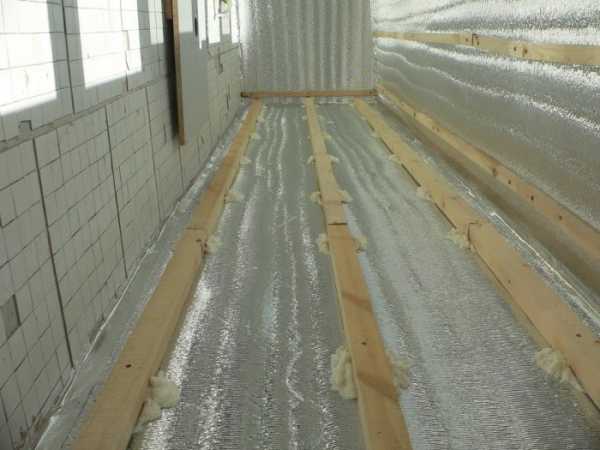 - Расстелить дополнительный слой пенофола металлизированной стороной вверх по всей площади балкона.
