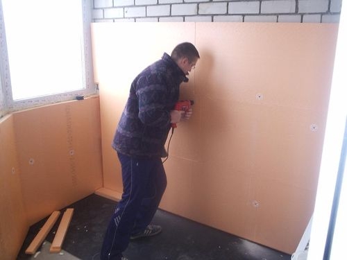 Убедившись, что пеноплекс хорошо держится на стене, усиливаем крепление утеплителя тарельчатыми гвоздями (зонтиками). Лучше брать пластиковые гвозди и дюбели. Они дешевле металлических и не проводят холод.