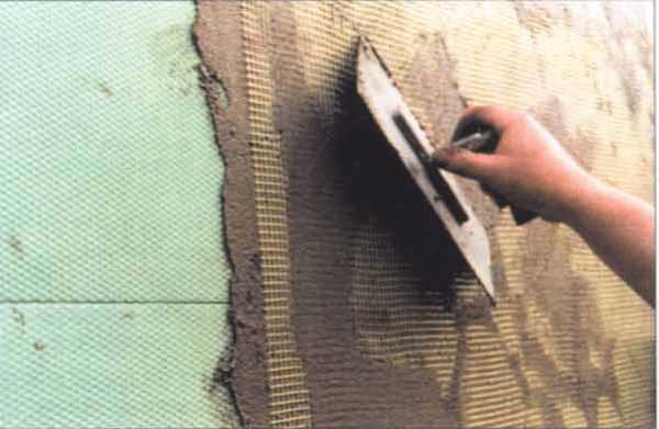 - На оклеенную панелями утеплителя стену крепим штукатурную сетку из стеклоткани. Чаще всего для крепления используются выравнивающие клеи, однако допускается и механическая фиксация.