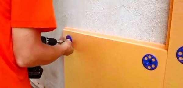 - Приклеенные панели можно дополнительно зафиксировать дюбель-зонтами. Обычно это делается в том случае, если крепятся толстые плиты полистирола.