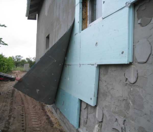 - К стене крепят специальную гидроизоляционную пленку. Пеноплекс не впитывает влагу, поэтому этот этап можно пропустить. Это необязательное условие, но лучше перестраховаться.