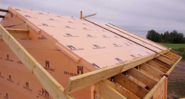 На стропила крепится обрешетка из бруса. Шаг обрешетки зависит от вида кровельного покрытия и составляет от 30 до 60 см. Поверх каркаса из бруса настилают пароизоляционный материал, располагая его горизонтальными полосами от карниза до конька. Полосы пленки стелют внахлест, накрывая нижний ряд на 10-15 см. При этом материал должен слегка провисать между брусьями, натягивать его нельзя. Стыки закрепляют скотчем, чтобы влага не проникла внутрь стропильной системы.