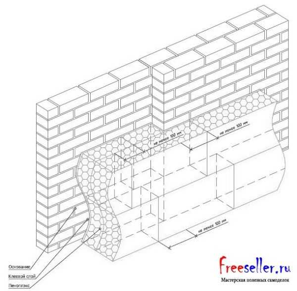 9) Приклеивание плит теплоизоляции необходимо вести рядами снизу вверх с перевязкой вертикальных стыков плит в каждом ряду (по типу кирпичной кладки). Недопустимо совмещение вертикальных стыков плит на одной линии.