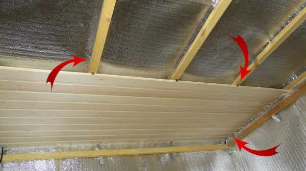 - со стороны помещения на потолке в одной плоскости осуществляют укладку досок шириной 5 см максимально плотно друг к другу, чтобы не оставалось зазоров. Краями их крепят к стенам строения;