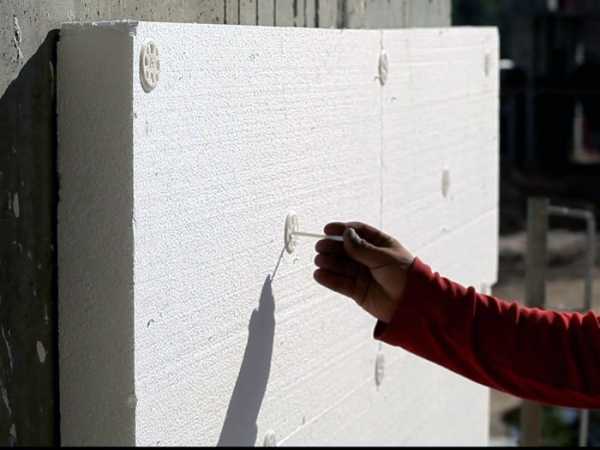- Фиксация при помощи дюбелей. Закрепление проводится только после полного высыхания клея – примерно сутки. На упаковке конкретной марки клея указывается более точный временной промежуток. Одну плиту фиксируют до 8 дюбелей в соответствии с ее размером.